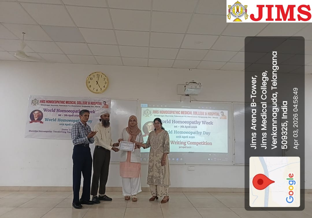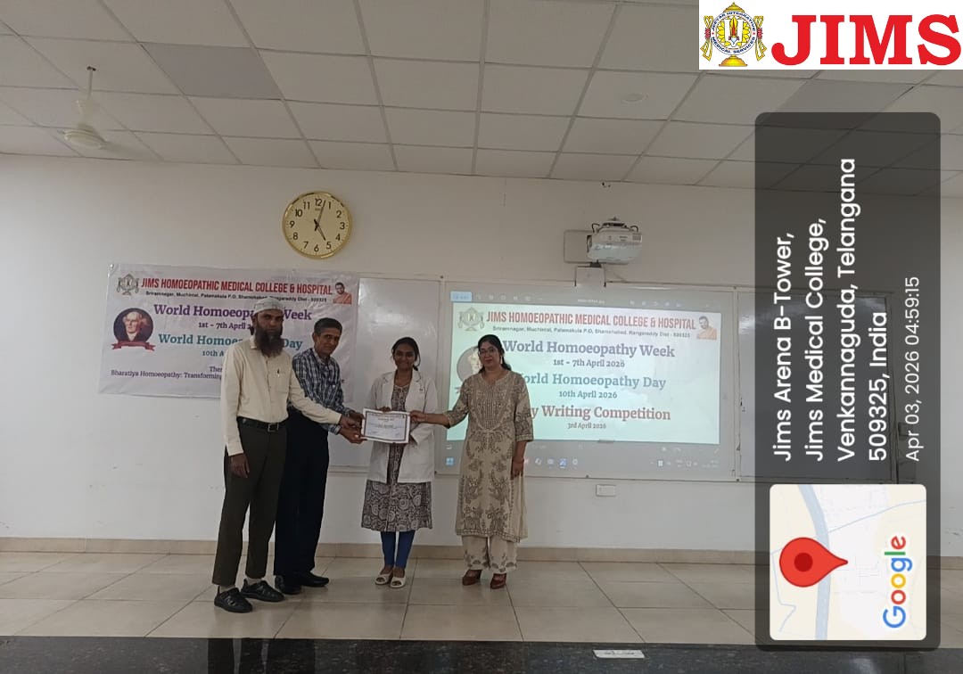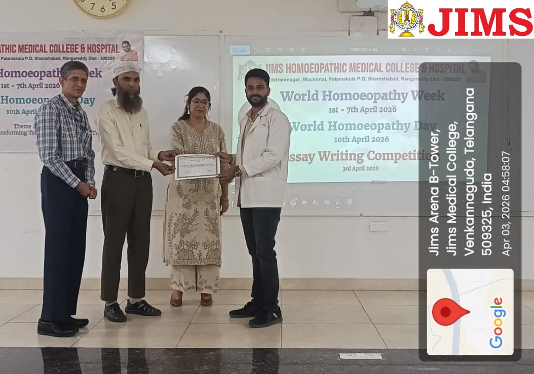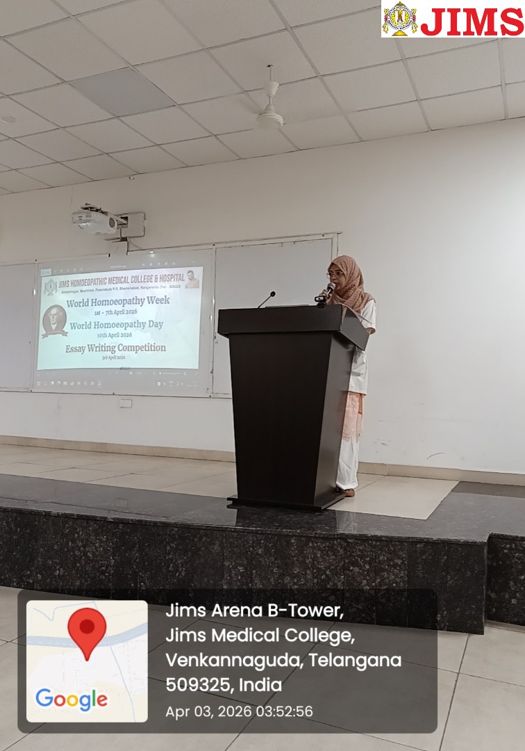 As part of the ongoing celebrations of World Homoeopathy Week 2026, JIMS Homoeopathic Medical College & Hospital successfully conducted an Essay Writing Competition on 3rd April 2026. The event was organized as an academic excellence initiative for both undergraduate students and postgraduate scholars, aiming to foster critical thinking, analytical reasoning, and scientific writing skills among budding homoeopaths.
