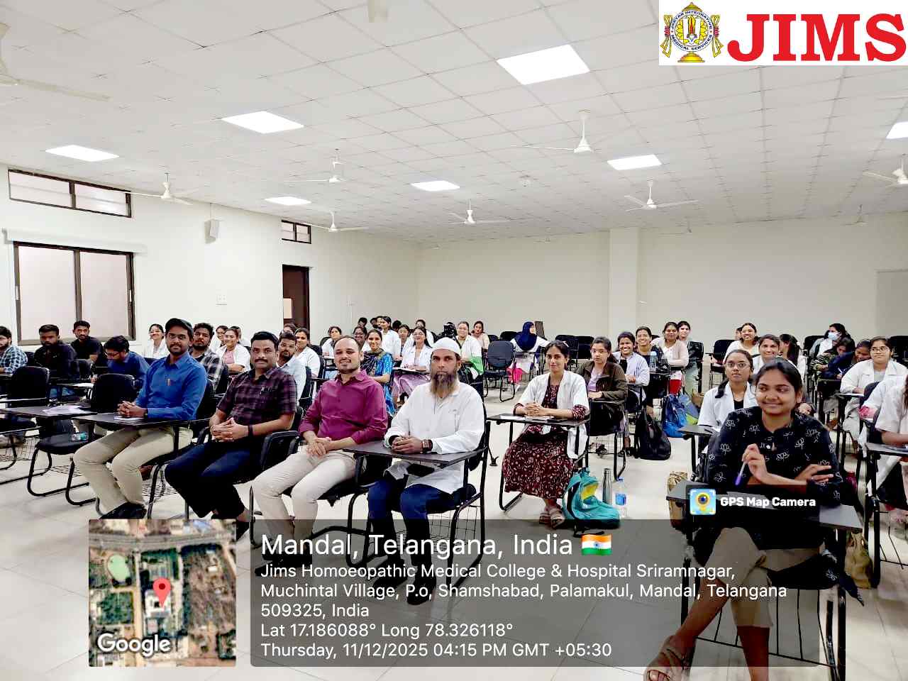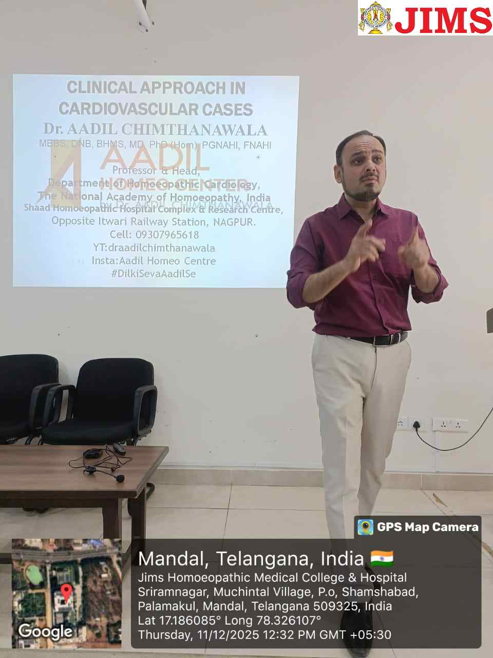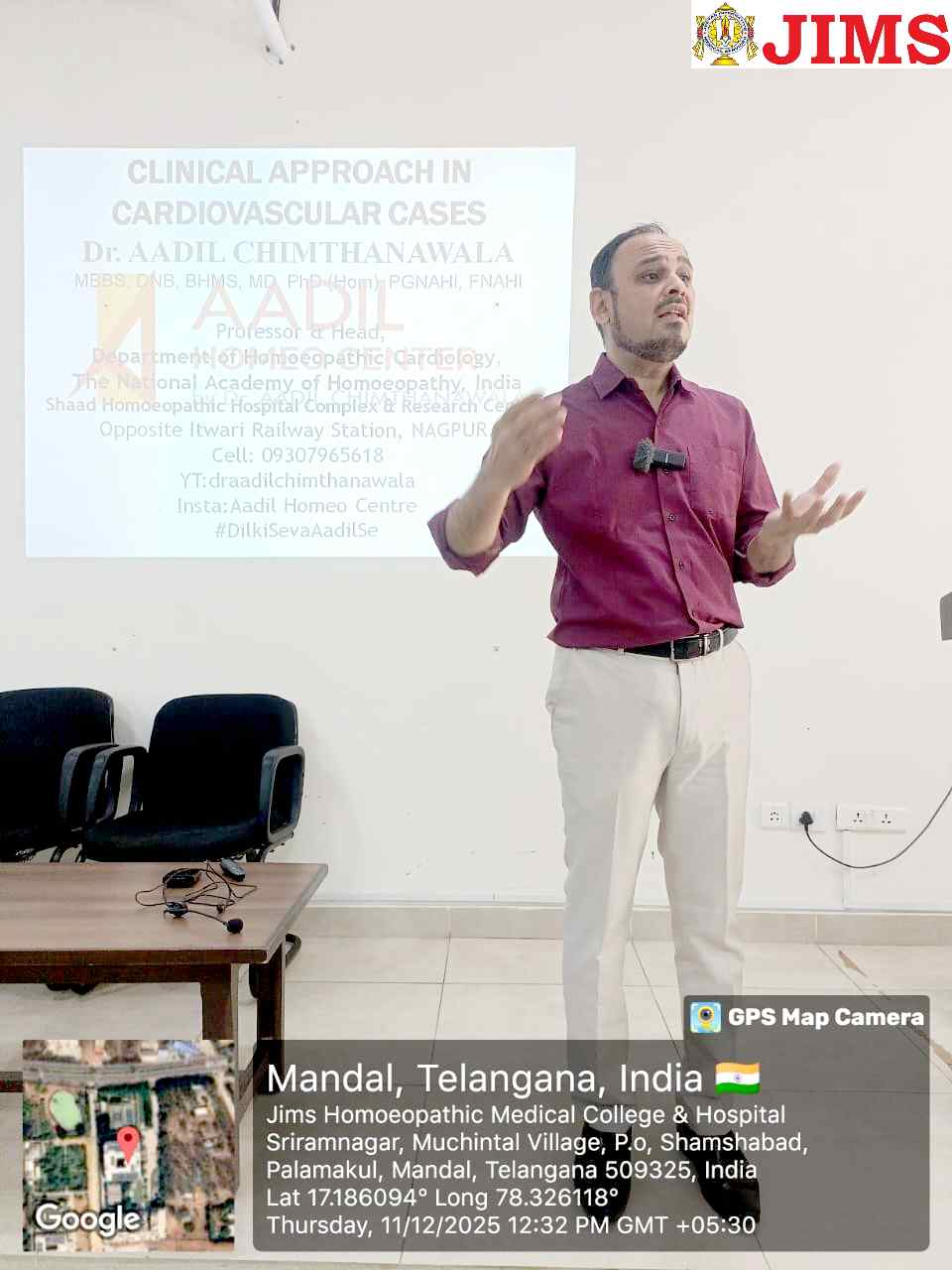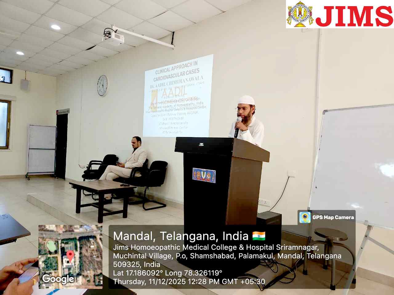 JIMS Homoeopathic Medical College & Hospital organized a seminar on 11 December 2025 from 12:00 PM to 4:00 PM, focusing on the Homeopathic Approach in Cardiology. The session was delivered by Dr. Aadil Chimthanawala, MBBS, MD (Medicine), BHMS, MD (Hom), PhD (Hom), a distinguished clinician and academician with expertise in both modern medicine and homeopathy. The seminar aimed to orient interns and postgraduate students about the scope and applicability of homeopathy in cardiac cases, especially its role as an adjunct therapy alongside conventional allopathic management.