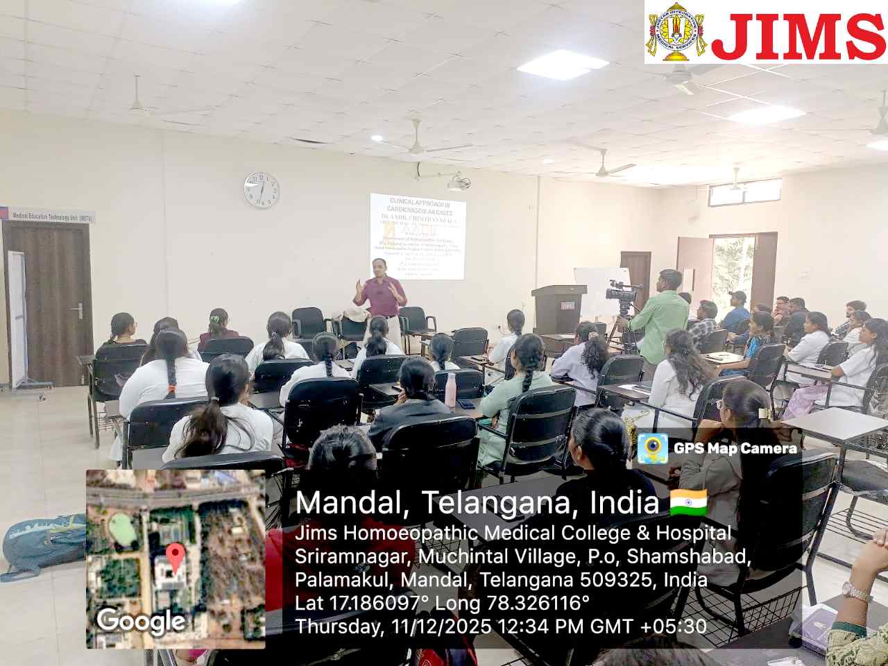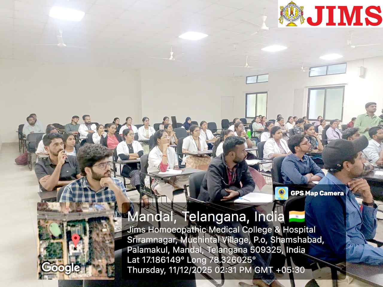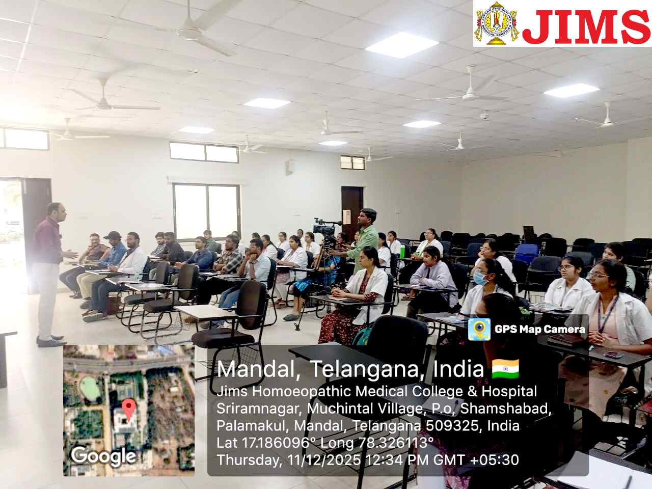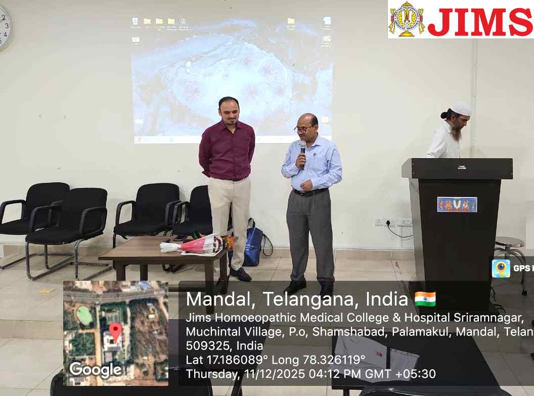 JIMS Homoeopathic Medical College & Hospital organized a seminar on 11 December 2025 from 12:00 PM to 4:00 PM, focusing on the Homeopathic Approach in Cardiology. The session was delivered by Dr. Aadil Chimthanawala, MBBS, MD (Medicine), BHMS, MD (Hom), PhD (Hom), a distinguished clinician and academician with expertise in both modern medicine and homeopathy. The seminar aimed to orient interns and postgraduate students about the scope and applicability of homeopathy in cardiac cases, especially its role as an adjunct therapy alongside conventional allopathic management.