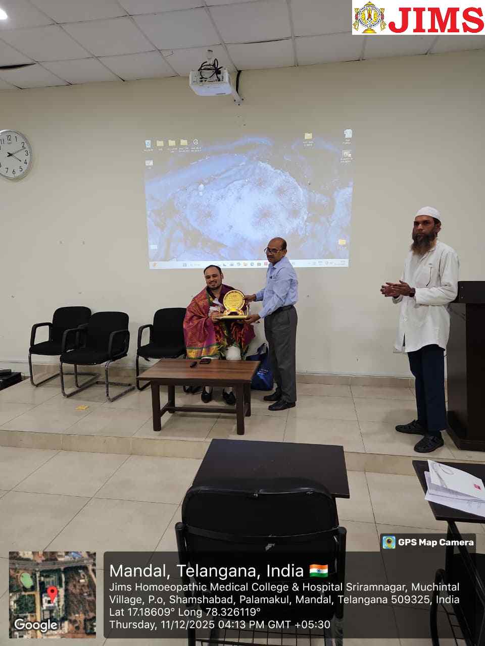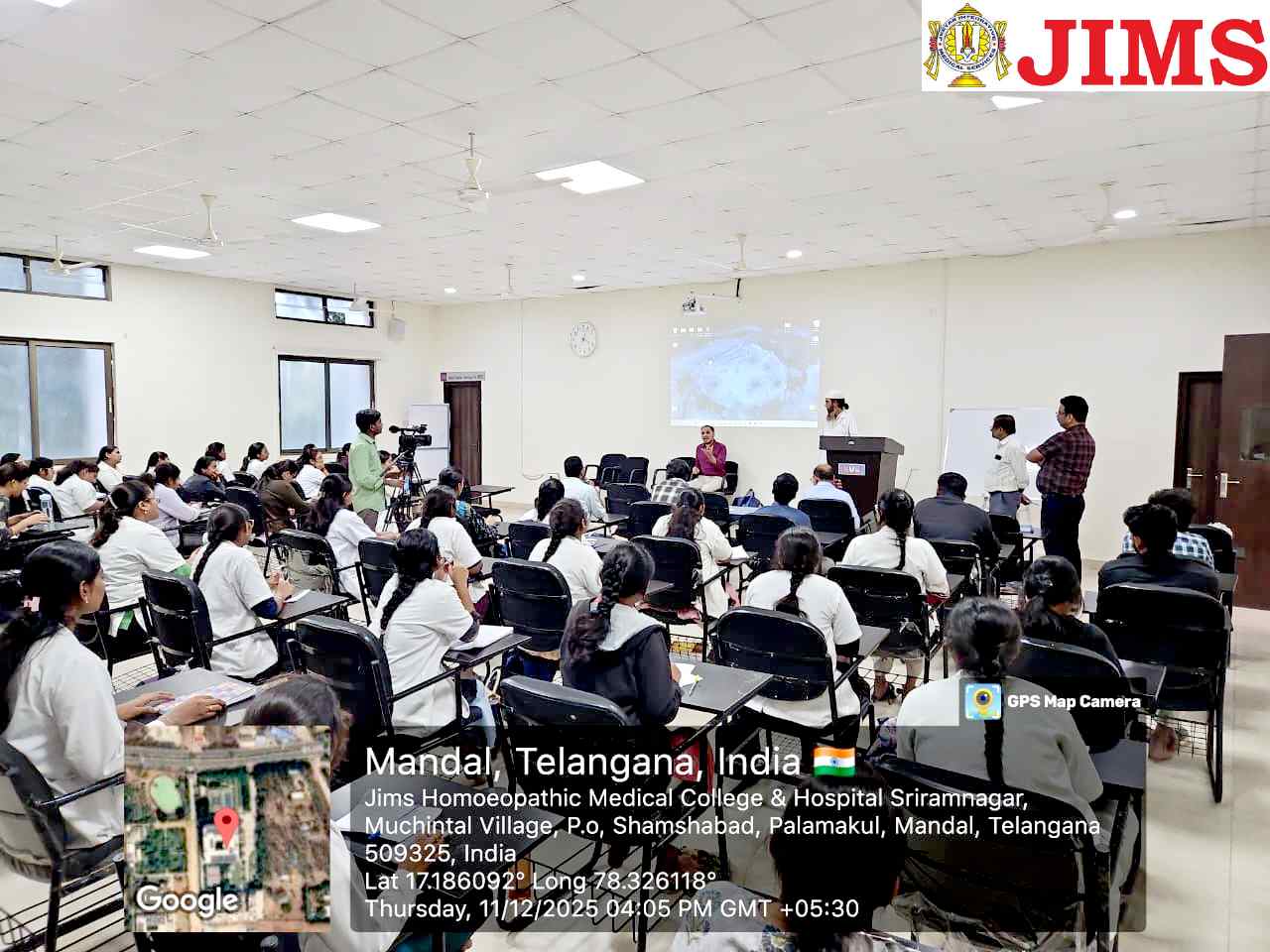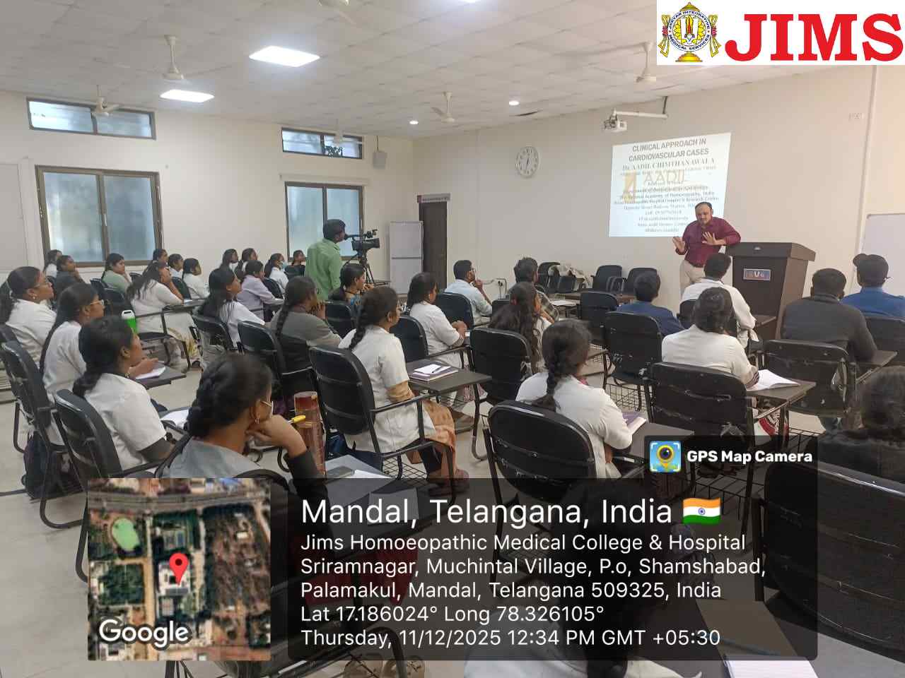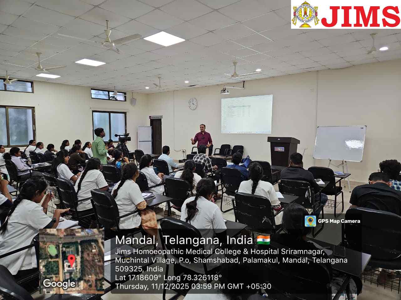 JIMS Homoeopathic Medical College & Hospital organized a seminar on 11 December 2025 from 12:00 PM to 4:00 PM, focusing on the Homeopathic Approach in Cardiology. The session was delivered by Dr. Aadil Chimthanawala, MBBS, MD (Medicine), BHMS, MD (Hom), PhD (Hom), a distinguished clinician and academician with expertise in both modern medicine and homeopathy. The seminar aimed to orient interns and postgraduate students about the scope and applicability of homeopathy in cardiac cases, especially its role as an adjunct therapy alongside conventional allopathic management.